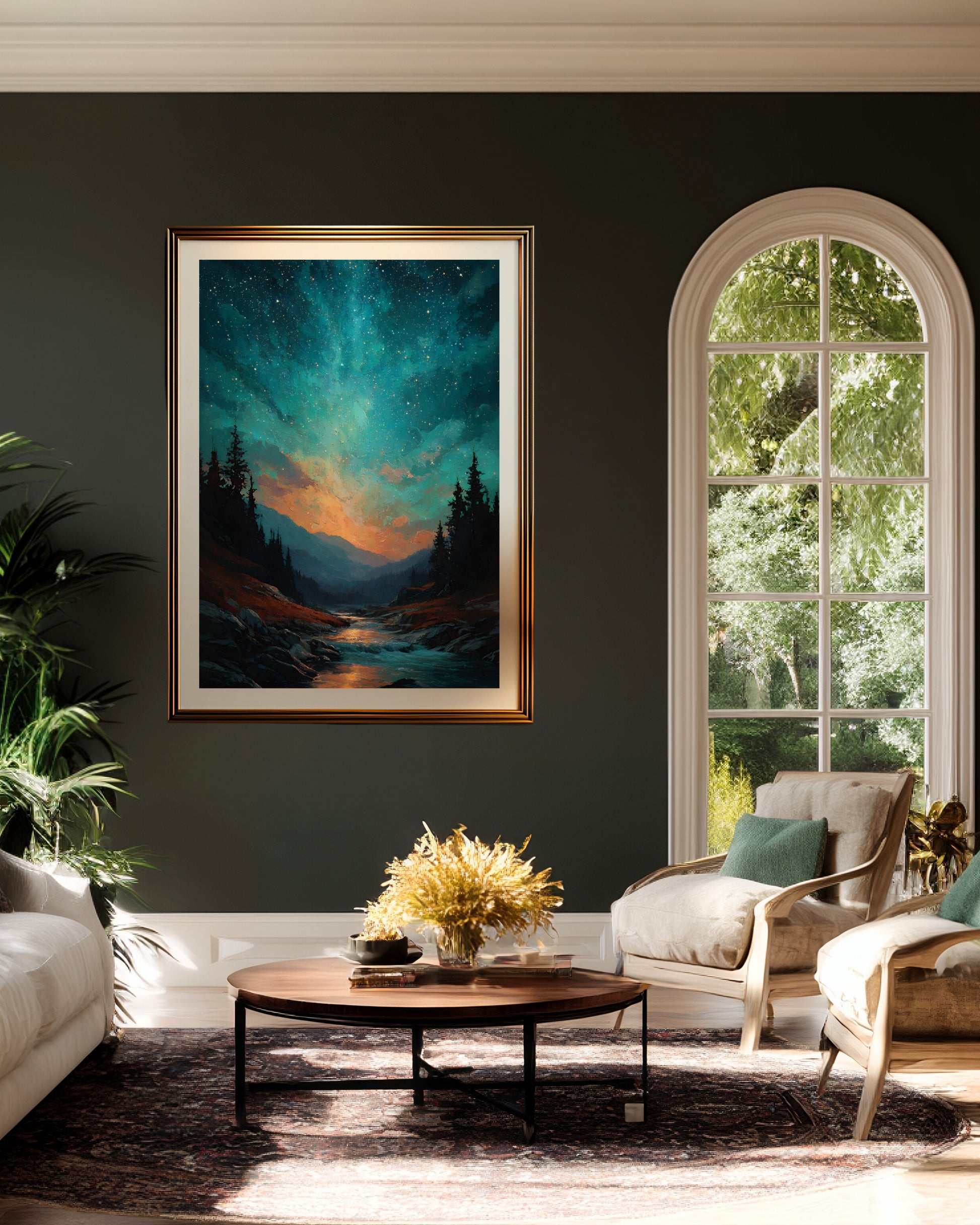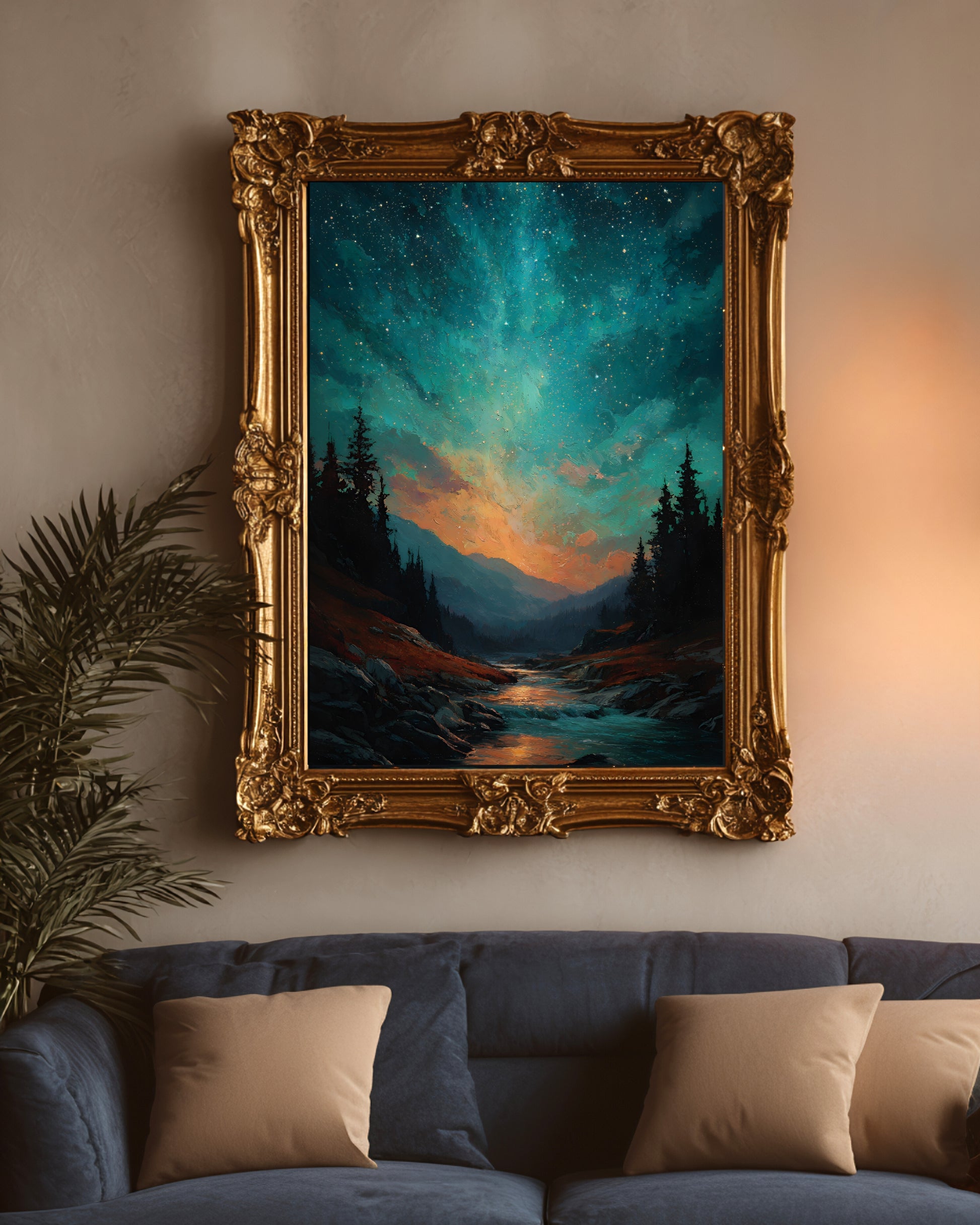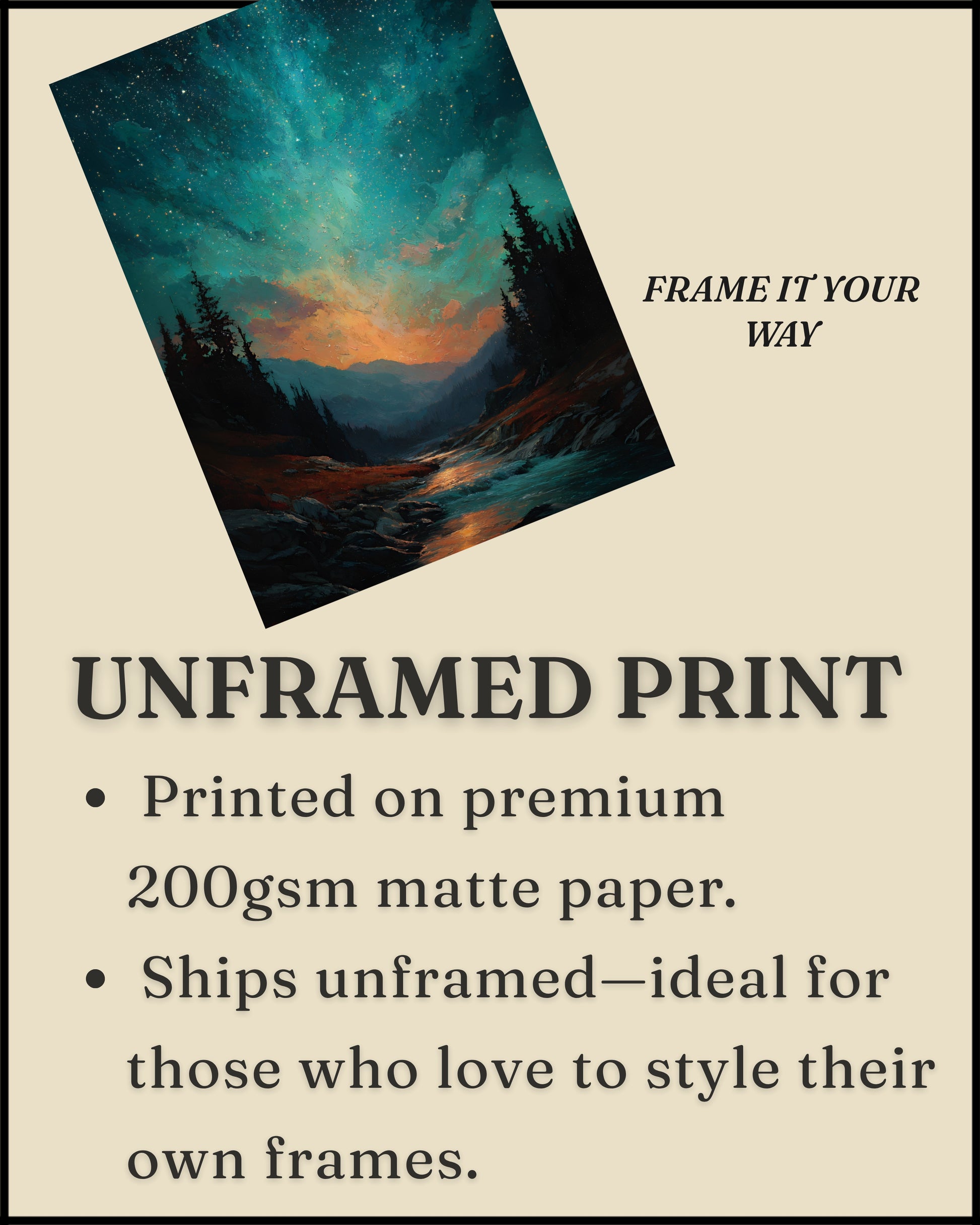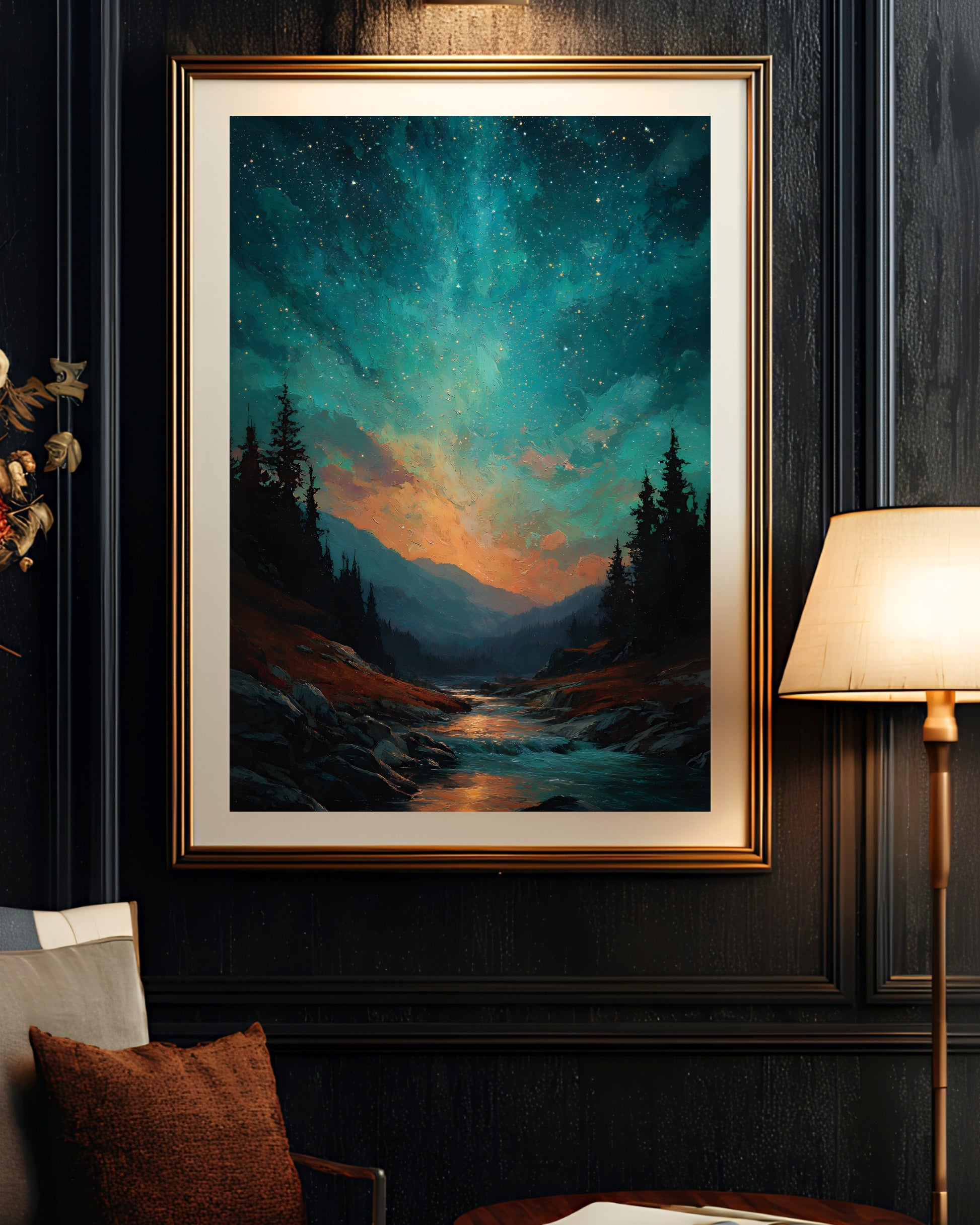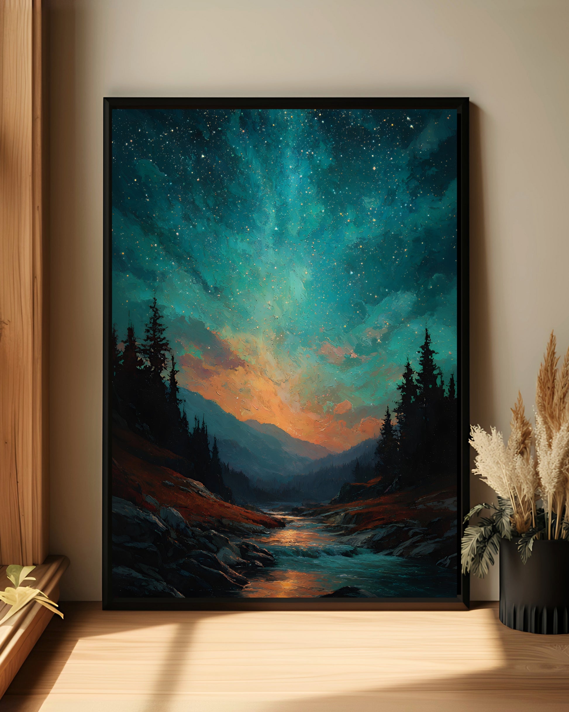 Immerse yourself in a night of wonder with this dreamy landscape print. A luminous cosmic sky bursts with stars above a peaceful forest valley, where glowing water winds through rocky terrain under towering pines. With rich teals, fiery oranges, and deep blacks, this piece blends celestial energy with natural beauty—perfect for moody interiors, nature lovers, and stargazers drawn to bold color and mystical light.