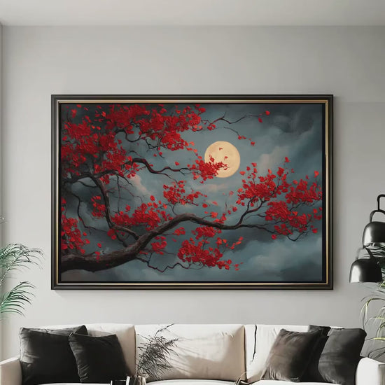 - Bold red moonlit canvas → evokes tranquility and timeless art decor