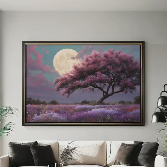 Celestial Wall Art – Moonlit Tree Artwork on Lavender Field Canvas Print