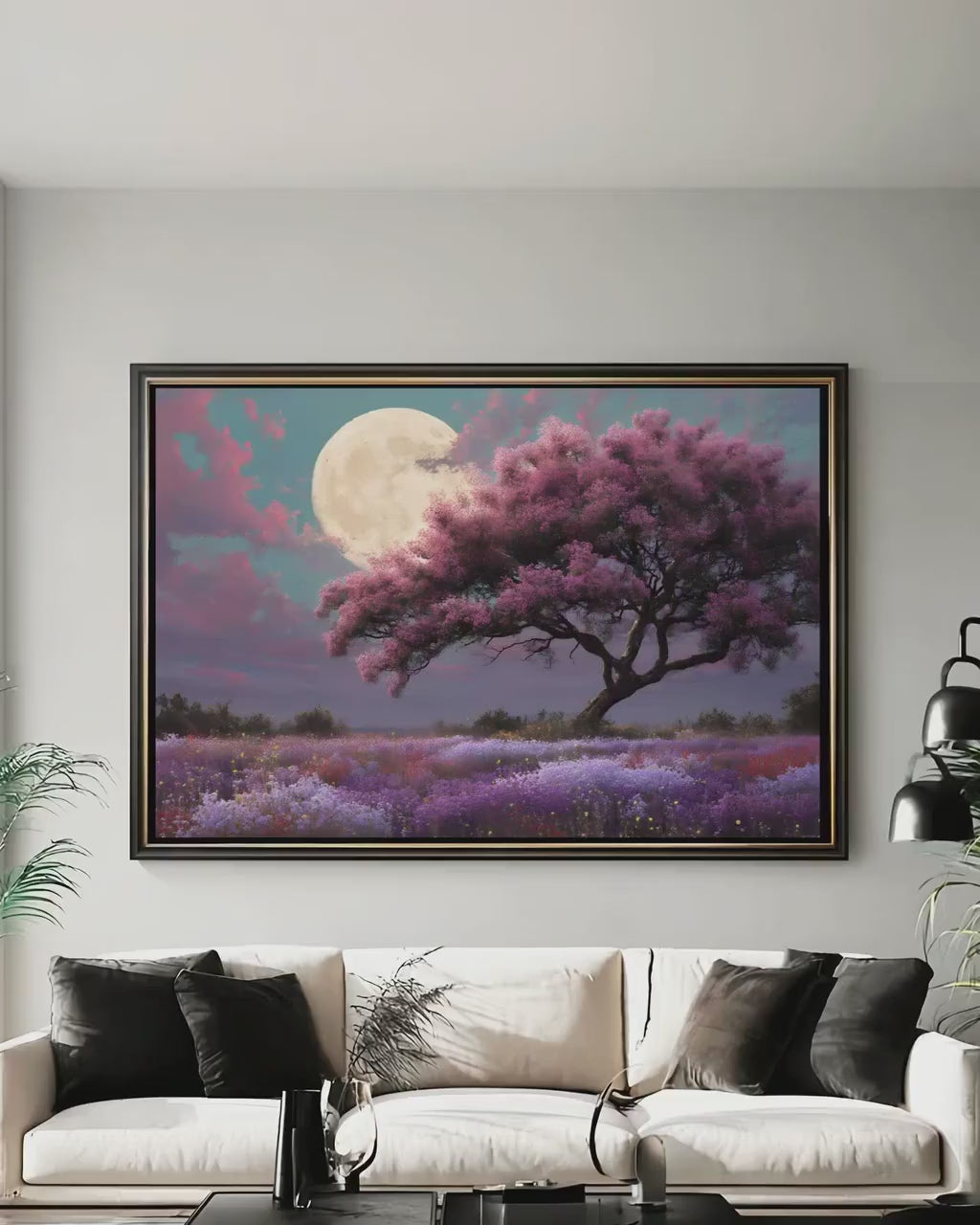- Moonlit tree artwork glowing over lavender fields for serene ambiance