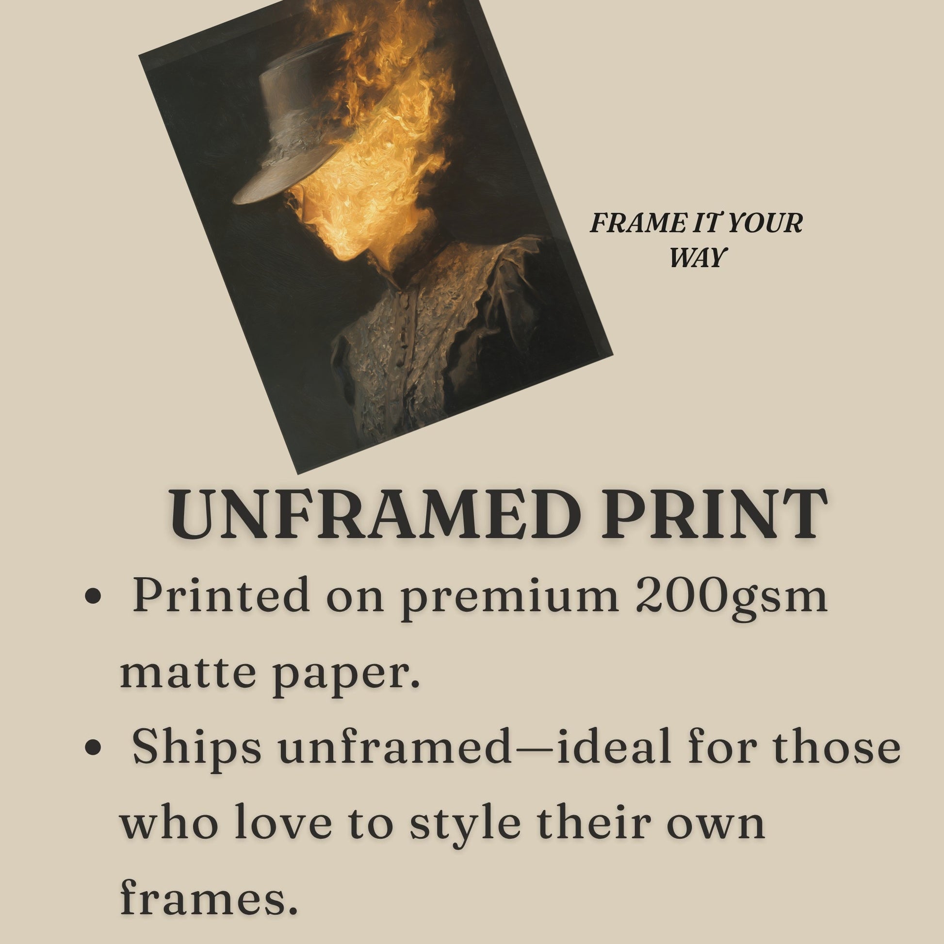 An arresting fusion of elegance and chaos, this surreal portrait depicts a faceless woman in Edwardian-style clothing with her head engulfed in dramatic flames. The warm firelight contrasts against the deep shadows and vintage textures, evoking themes of identity, transformation, and inner turmoil. Perfect for lovers of dark surrealism, moody interiors, and art that demands a second glance. This piece brings a mysterious, cinematic edge to any space.