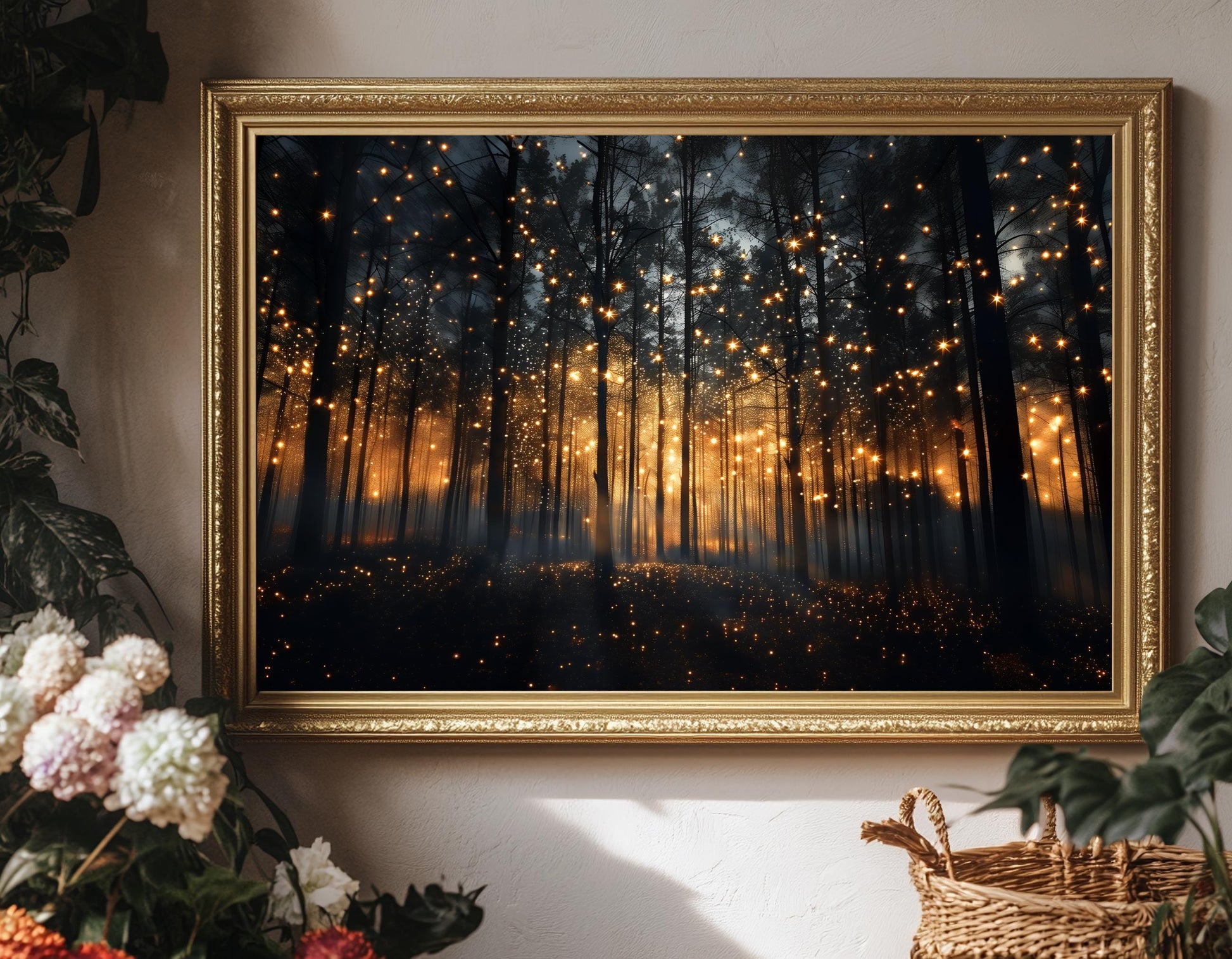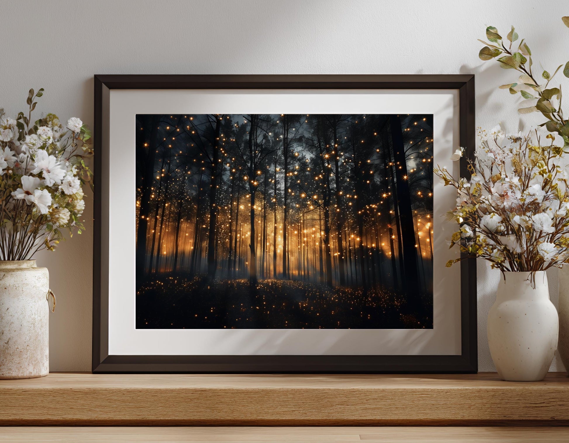 This magical forest art print captures a serene night landscape filled with playful lightning bugs, creating a whimsical nature print that transforms any space. Perfect as dark academia wall art, this botanical art print brings enchanted forest artwork into your home office or living room, offering a moody canvas wall art experience that delights firefly enthusiasts and nature lovers alike.