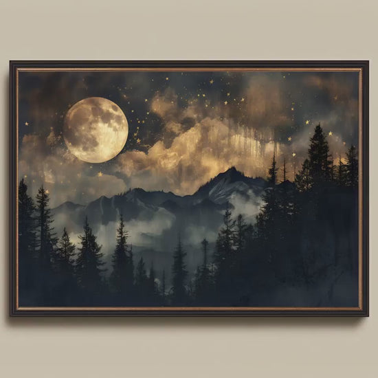 Discover the moody moonlit mountain art that transforms any room with its captivating celestial canvas art. This framed wall art features a dark art decor style perfect for moody living room art or moody bedroom decor, creating a mystical wall hanging that enhances your moody home decoration. Crafted on premium cotton polyester canvas with a pinewood framed print, this unique wall artwork brings both style and substance to your space.