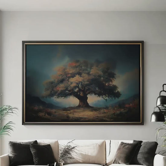 Enhance your living space with this Rustic Nature Canvas, featuring a stunning ancient tree artwork that brings the mystical beauty of nature indoors. This canvas showcases a grand, weathered tree framed by misty hills and earthy tones, creating a moody atmospheric art piece that transforms any room with timeless nature artwork. Perfect for rustic home decor enthusiasts and lovers of fantasy landscape art, it delivers a captivating woodland scene poster feel that enriches living rooms, libraries, or offices.